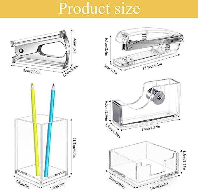 Detailed Sizes: the clear desk supplies are measured manually, the pen holder is about 10 x 6.5 x 6.5 cm/ 4 x 2.6 x 2.6 inches, the notepad holder is about 10 x 10 x 4.5 cm/ 3.9 x 3.9 x 1.7 inches, the stapler is about 5.25 inches in length, the tape dispenser is about 4.75 long and the staple remover is about 2.36 inches long, suitable for placing on the desk