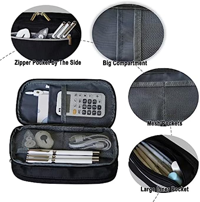 Large Capacity: Dimensions is 8.74*5.11*1.18 inches. The main compartment fit up to 50-70 pens/pencils, and can store small stationery in the side pockets, such as notes, sticker, etc. The other compartment, can put a few shorter pens that are often used, even scissors, rubber, tape can be easily stored, and can hold a calculator and rulers, staplers. This compartment design not only protect stationery and accessories in a better way, but also keeps things neatly organized and accessible.
